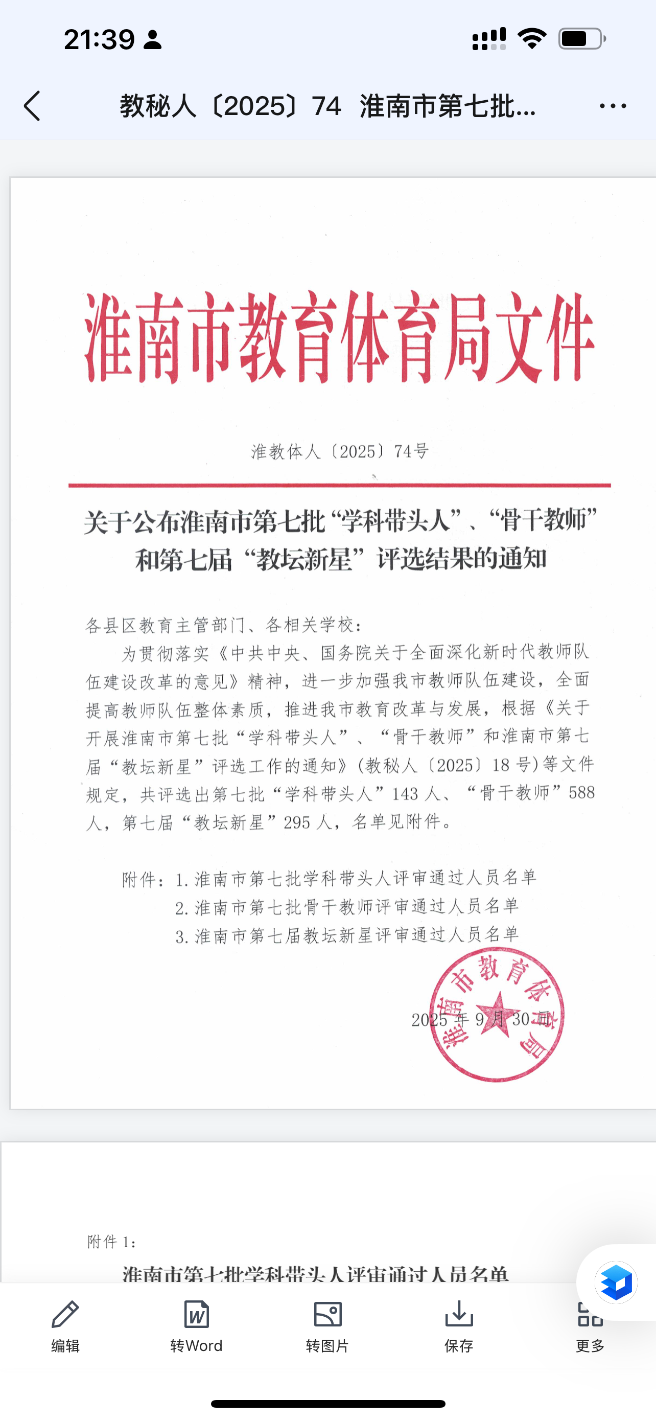 近日,2025年度淮南市第七批“学科带头人”、“骨干教师”及第七届“教坛新星”选结果正式揭晓。我校教师凭借深厚的专业素养与卓越的教学能力脱颖而出,在此次评选中再获佳绩!其中,4位教师获评市级“学科带头人”荣誉称号,3位教师获评市级“骨干教师”荣誉称号,4位教师获评市级“教坛新星”荣誉称号。
