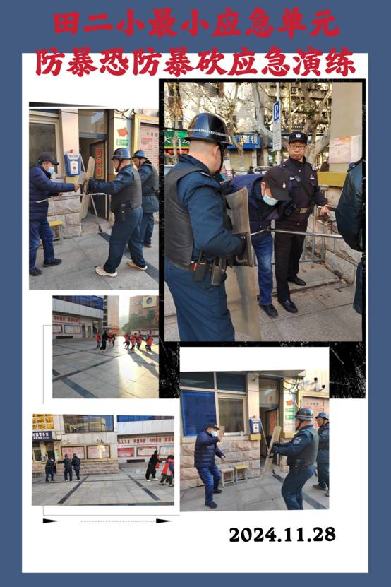为有效预防和处置各类恶性伤害师生案件,提升师生安全意识和自我保护能力,检验学校安保人员和师生的应急反应和处置能力,我校于2024年11月28日上午进行了最小应急单元反恐防暴砍演习演练。