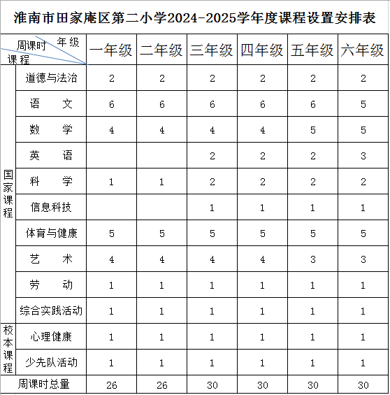按照《安徽省义务教育课程实施方案》要求,我校制定了《田家庵区第二小学课程设置安排表》