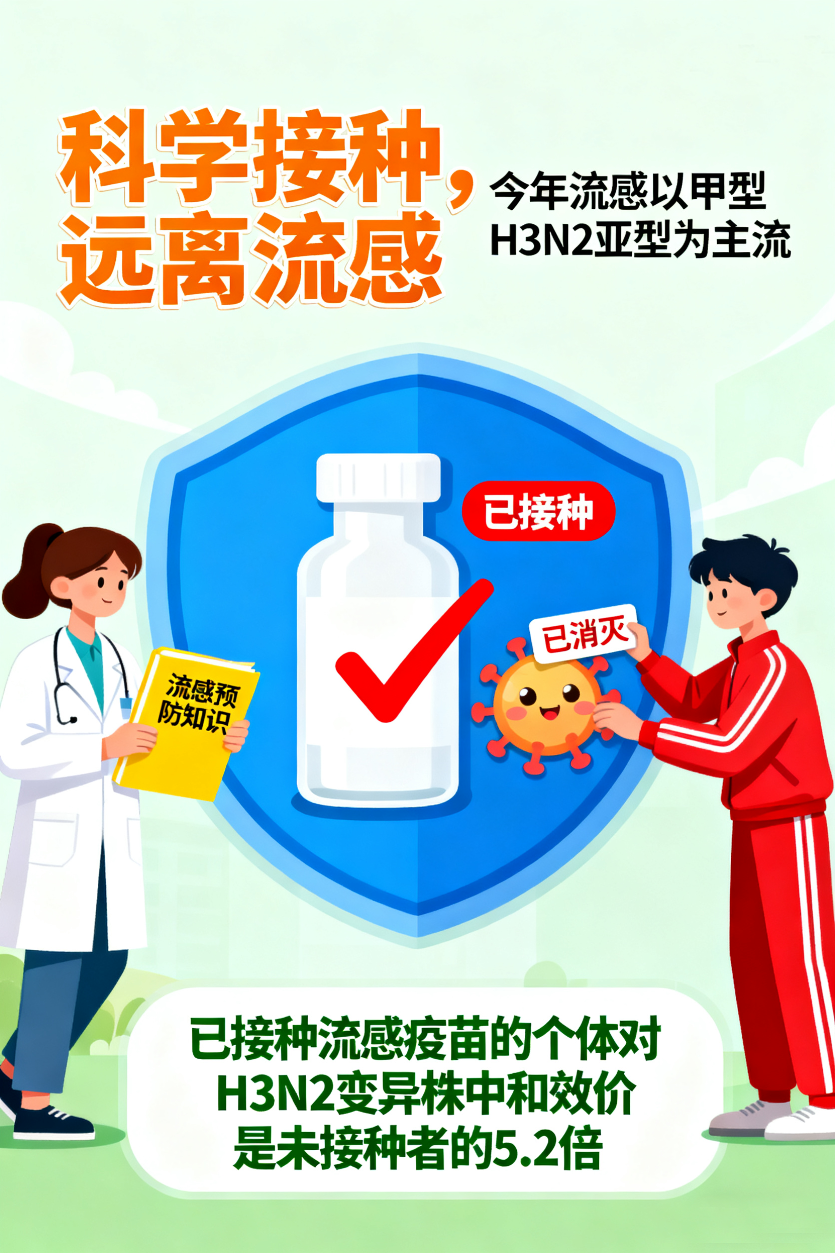 接种流感疫苗是预防流感最经济、有效的措施。今年的流感疫苗覆盖H3N2,接种流感疫苗对个体来说可减少感染、减轻症状、缩短病程、显著降低发展为重症和死亡的风险。已接种疫苗的个体对H3N2变异株中和效价是未接种者的5.2倍。对群体来说,较高的接种率能够减缓病毒在人群中的传播速度,降低疫情暴发风险。