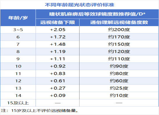 我国首个远视储备评价国家卫生健康行业标准《儿童青少年裸眼视力和屈光状态评价规范》(WS/T 10039-2025)于2026年3月1日起正式实施,该标准明确了各年龄段“远视储备量警戒线”(散瞳验光后等效球镜度数)。