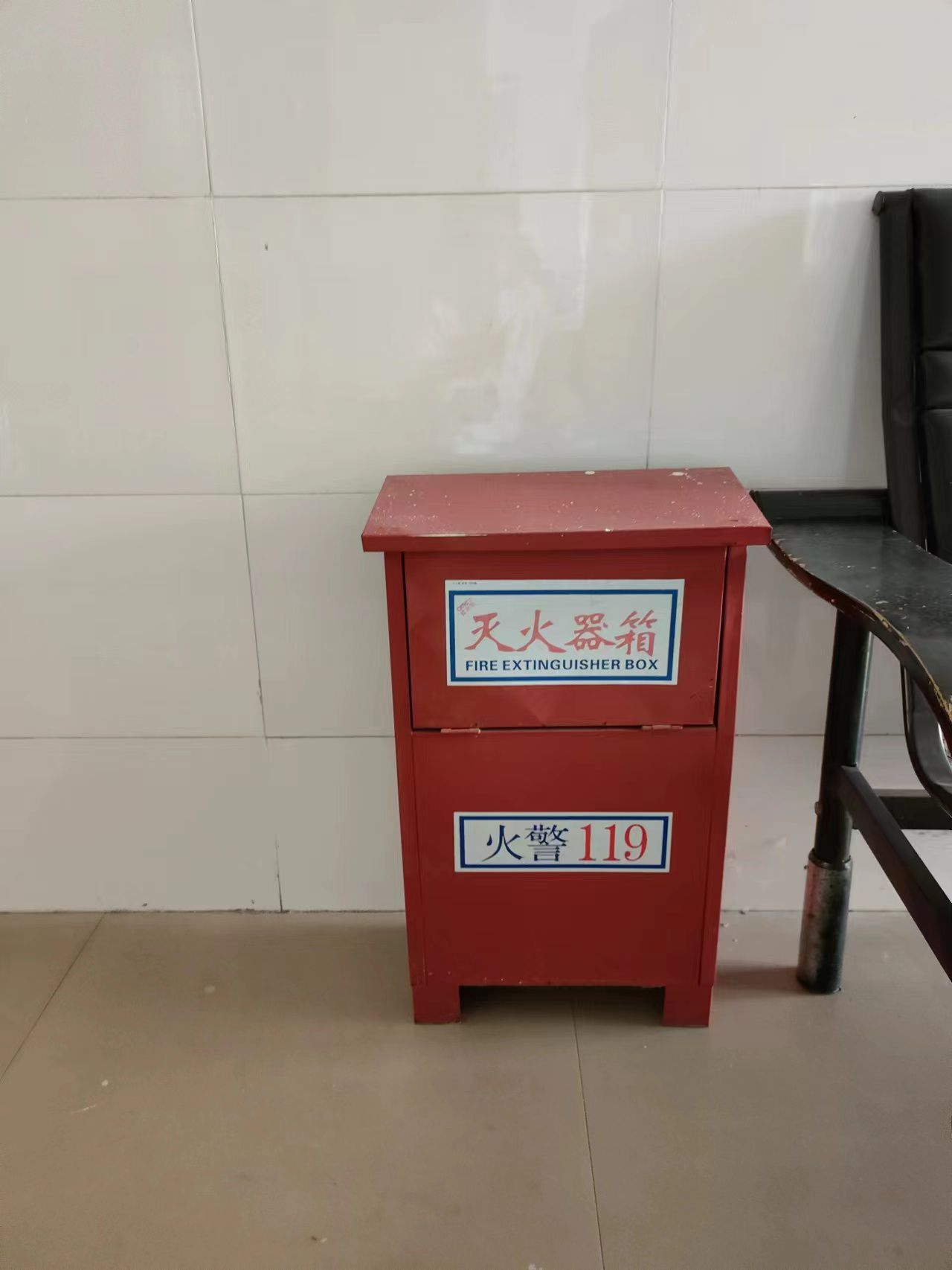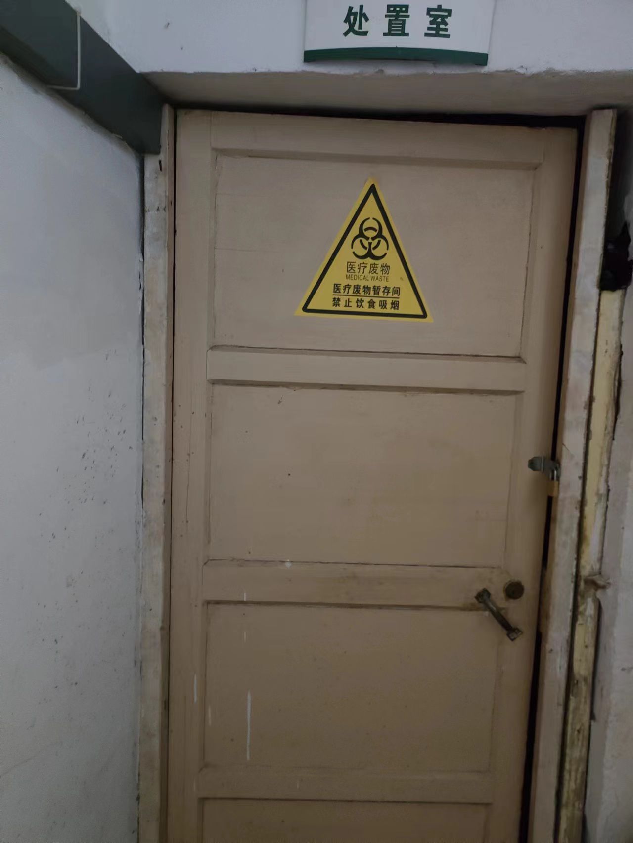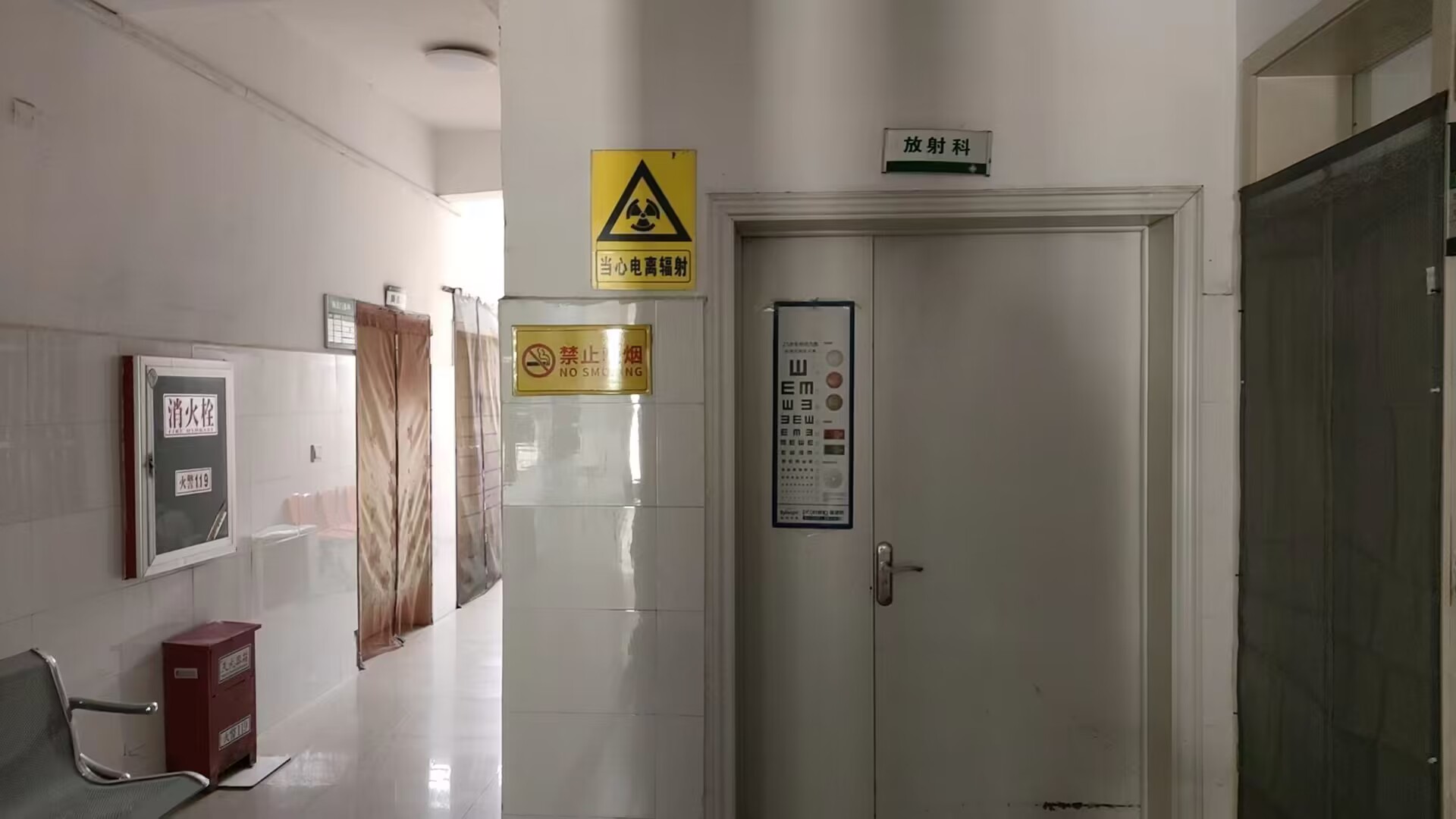 一楼院内北侧设有医疗废弃物处置室,放射科室内外均设置电离辐射安全警示、每一楼层两侧均放置灭火器。