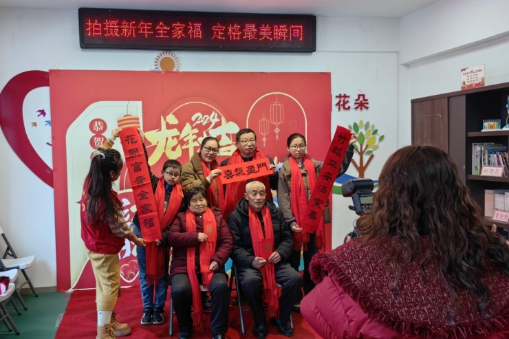 活动现场,以龙年大吉为主题背景,红色围巾衬托出新年氛围,摄影师认真布置拍摄场景,精心调控相机,用心抓拍每一个精彩瞬间,一家六口笑容满面,其乐融融的温馨场景,传承了中华民族承欢膝下的传统美德。伴随着快门的咔嚓声,一张张幸福的画面在此刻定格,整个活动现场都洋溢着喜庆的节日氛围。